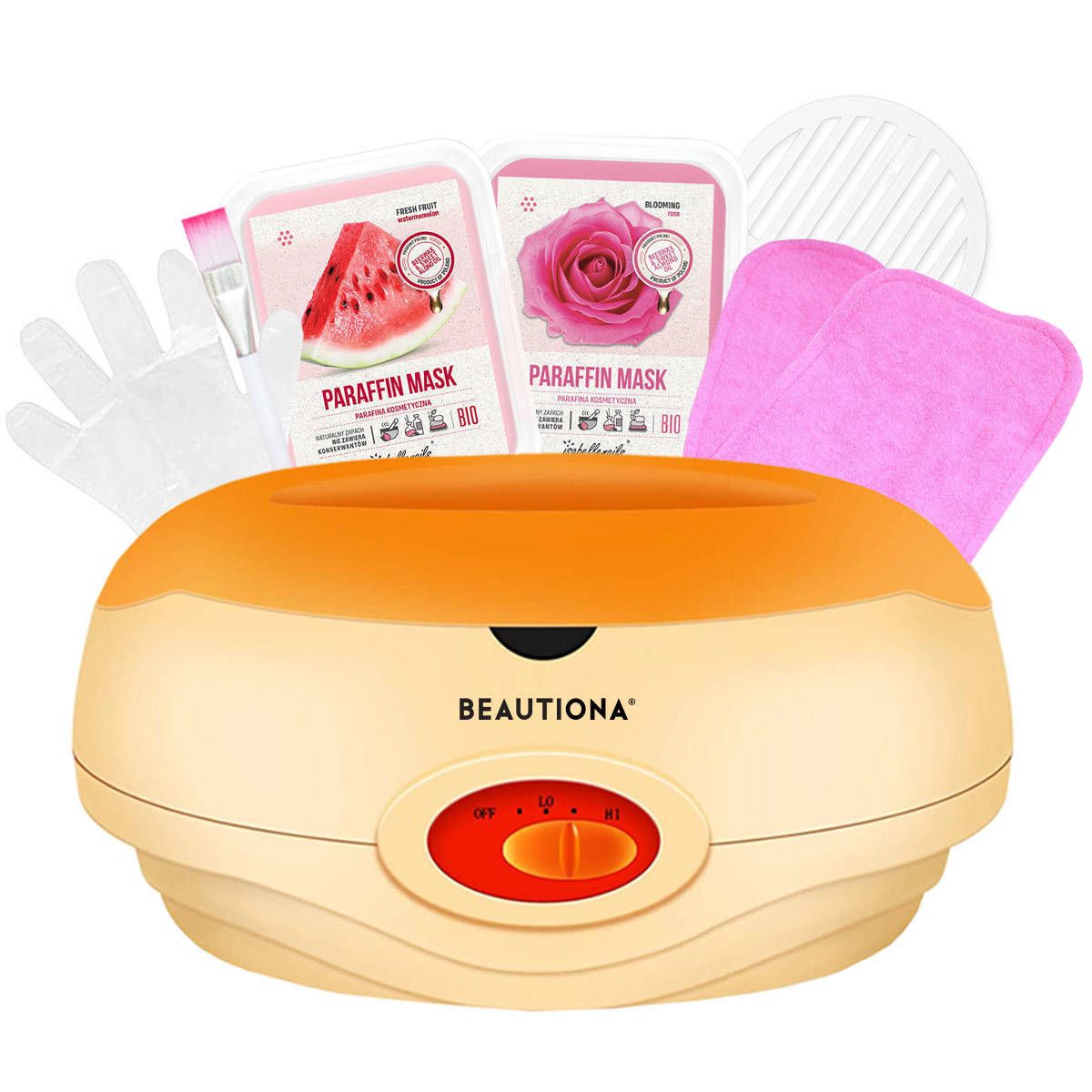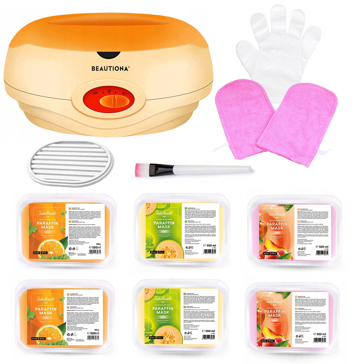Komplett paraffingép szett Paraffinos kezeléshez, amiben megtalálsz 1db paraffin melegítő gépet narancs vagy fehér színben, 6db 500ml választható paraffint, 1 pár frottír kesztyűt, és 100db fólia kesztyűt.